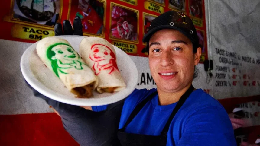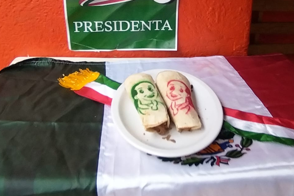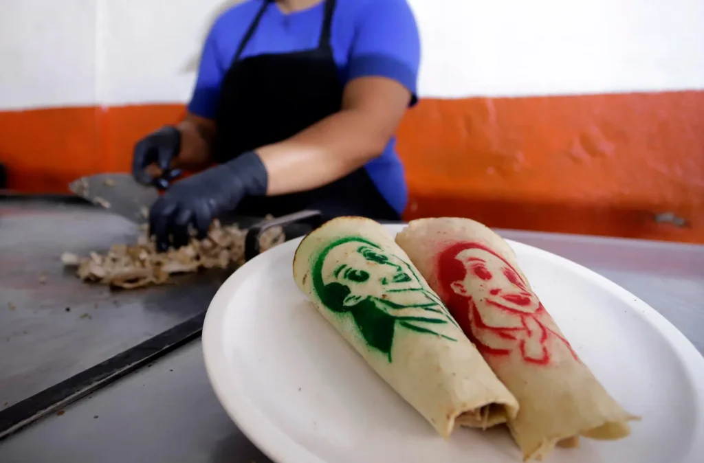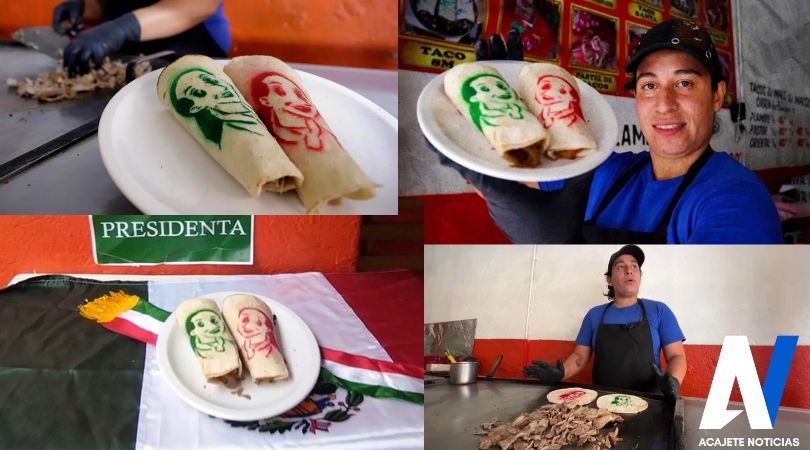 Para este taco, en las blancas tortillas de harina, se pinta la imagen de la próxima presidenta de México, Claudia Sheinbaum, con un dibujo animado de su imagen en colores rojo y verde de pinturas vegetales, que representan los colores de la bandera mexicana.