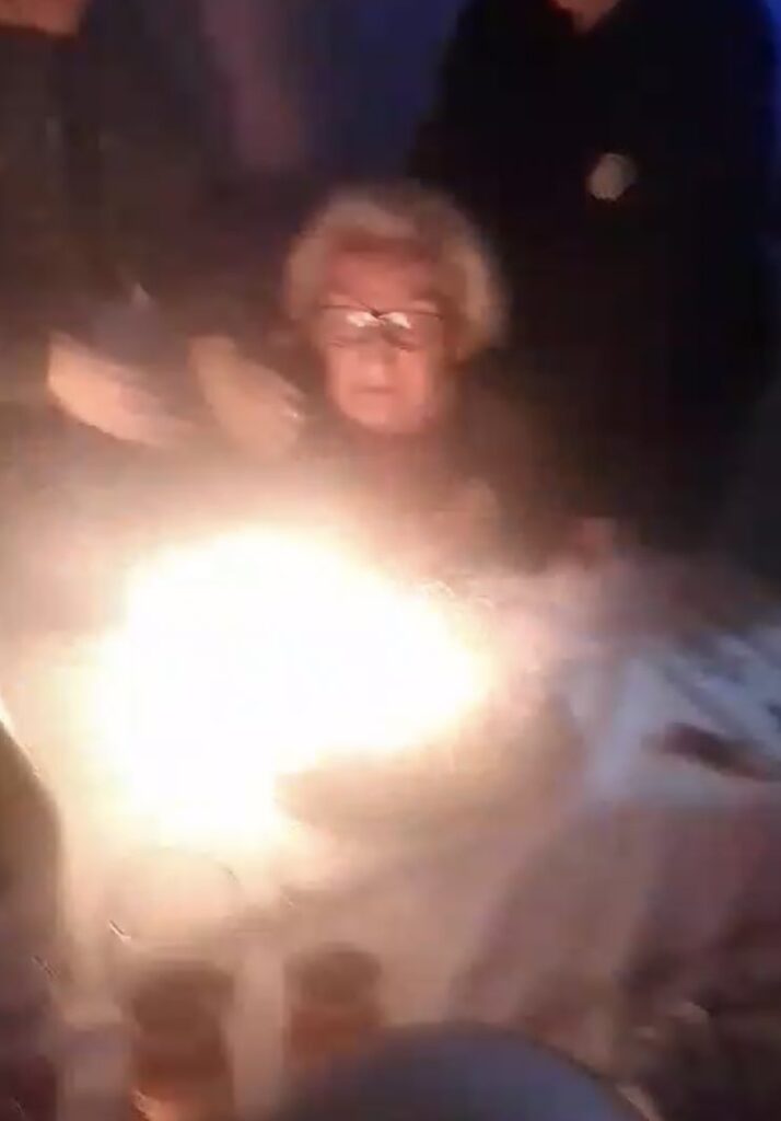 El pastel brillaba más de lo usual e iluminaba toda la habitación. De repente, la llama creció más de lo esperado y por lo que la señora intentó soplar las velas para apagarlas.