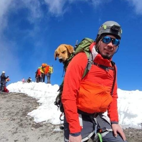 Los montañistas Aarón y Héctor Hernández, metieron en una mochila al “Canelo”, para trasladarlo a tierra firme; mientras en Facebook recibían felicitaciones por la buena obra que realizaron de salvar a la mascota de morir congelada o quedar ciega.
