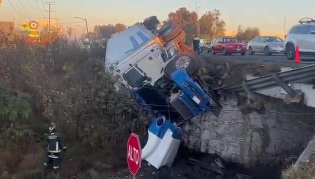 En la autopista México–Puebla, con dirección a Veracruz, se registró la volcadura de un tractocamión a la altura del puente de San Francisco Ocotlán, luego de que la unidad derribara la valla de contención y quedara a punto de caer hacia la vialidad inferior.
